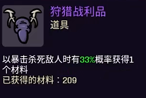 除了“背包”以外,还有更好的上位选择,那就是“狩猎战利品”,不过这个道具的效果需要暴击才能够触发,因此收藏家在前期暴击低的时候是比较难触发的,建议中期点了足够的暴击率之后再去拿它,它可以让你在暴击之后有33%几率获得一个材料,考虑到副本中的怪物数量众多,所以其实际触发频率还是很高的,一局下来往往可以给玩家带来好几百的额外材料收益。