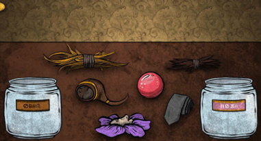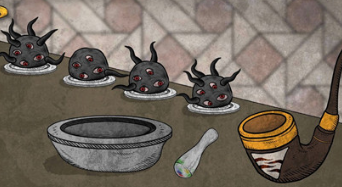 5,【爸爸的习惯】爸爸也不在吸食烟草了,现在抽的是由一个黑色的虫子进行加工的粉末,玩家们观察烟斗上的图案,玩家们需要把桌上四个黑色的虫子进行研磨,虫子上长满的触角,需要根据触角的多少对应烟斗上的图案进行研磨就可以了!