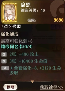 席恩刚开始获得的时候其实算是一个二星的卡牌,在上面大家可以将卡牌的最强能力发挥出来的时候肯定是进行了强化之后,进行强化之后那么席恩可以达到八级,在这之后她就不可以继续进行强化了,这个时候原有的攻击力就能够达到极限的数值,这就意味着大家使用这张卡牌的话代表玩家本身的这个角色也会增加9000的战力,而且席恩还可以搭配其他的同名卡牌,这样带来输出会更高。