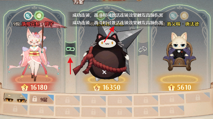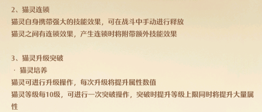 玩家们放入主战的猫属性将100%转换增加给角色;放于助战的猫属性将转化30%增加给角色。猫灵自身携带强大的技能效果,可在战斗中手动进行释放猫灵之间有连锁效果,产生连锁时将附带额外技能效果。