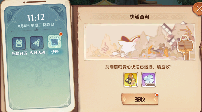 玩家们在主页面中找到【领取快递】,打开后就可以看到【瓦瑞嘉的爱心快递已送抵,请签收!】,这个奖励会从五分钟开始倒计时,时间到了会给玩家们发放一次奖励,一般是强化卷轴8个和50000个银花,在游戏中都是有很重要的用途的,但是需要注意的是玩家们到时间一定要记得领取。