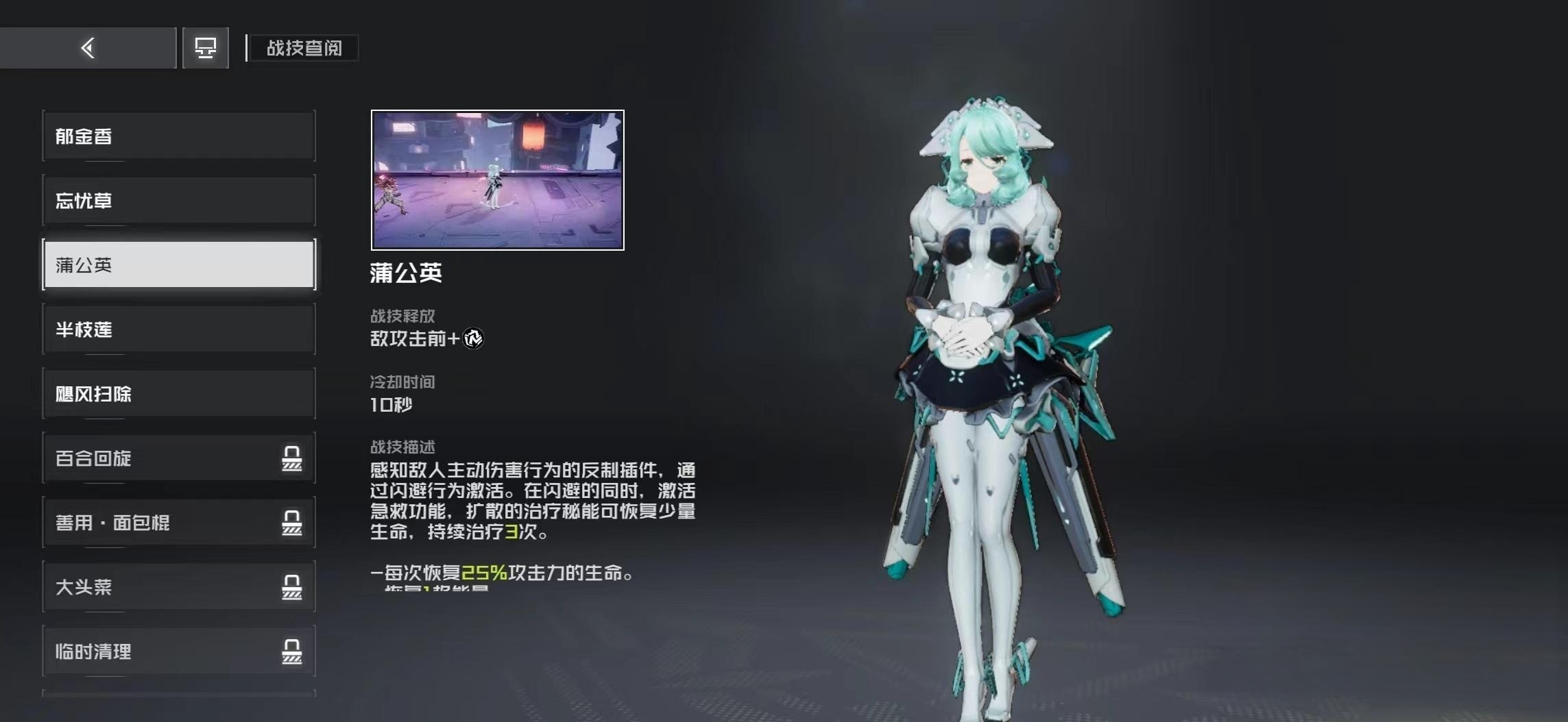 然后蒲公英则属于皎的闪避技能,该技能需要抢在敌人伤害你之前使用,通过成功闪避敌人的攻击可以触发技能的治疗效果,它能够为包含自己在内的周围友军恢复血量和能量,该技能从续航角度来看非常给力,它给了皎强横的生存能力和站场能力,后续输出起来也变得更加轻松。
