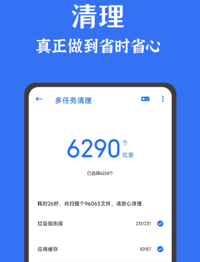 安卓清理君具有一键极速清理工具,清理时省心又省力,仅需几秒,各种需要清理的文件就会直接展现出来,页面简约,设计简洁,专注于垃圾清理系统优化,现如今已超过40多个功能,覆盖日常生活方方面面。