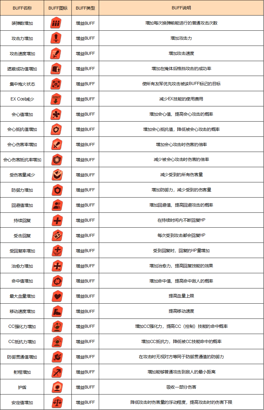 首先要知道的是在这款游戏当中一共有着四种不一样的buff,而她一共有四种不一样的颜色,分别是红蓝紫黄,随着颜色的变化,增益的效果也是不一样的,黄色在游戏当中是属于最高级别的特殊增益,紫色则是cc,蓝色是减益效果,红色是增益效果,红色的增益效果可以帮助职业角色们增加他们的攻击力和速度,同时在防御力和回避值上面也有一定提升。