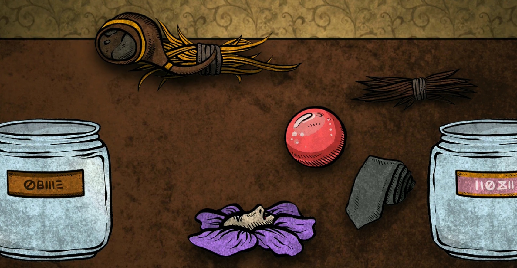 这一关的具体场景为:桌面的左侧和右侧分别摆着两个透明的玻璃罐子。而画面的中心摆放着藤条、领带、人脸花、烟管以及烟草。通过对画面的初步理解,我们可以很容易的掌握操作内容。也就是将桌面正中凌乱摆放的物品分别装在代表【父亲】的玻璃罐和代表【母亲】的玻璃罐中。