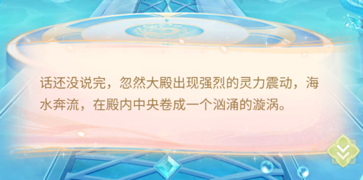 玩家们在偏殿中遇到了一个神秘的鲛人,这里需要和鲛人战斗,玩家们最少要有4张卡牌强化40级,战斗完成后,得知神秘鲛人叫朵朵,江湖了一些年幼事情海底内部的矛盾,在对话中玩家们得知了一个关键消息【定海神珠】,正当玩家们提起这个宝物的时候,突然大殿中出现了很强的灵力震动,在大殿中形成了旋涡。是海神留下的神识,这一关需要7.85万灵力才可以化解掉。