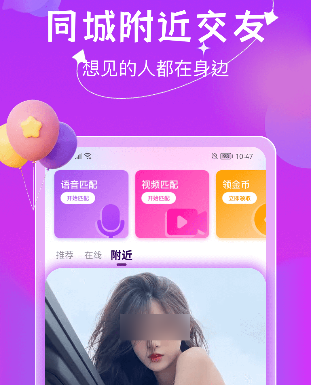 想要快速获得符合你理想型的附近好友那么就是这款软件了,能够帮助有用智能计算附件的用户数据并进行推送。如果已经是好友的话,可以查看好友的动态和照片。在交流上可以选择语音的方式进行交流,交流是不可以使用变声软件所以语音交流的时候是真是的声音。