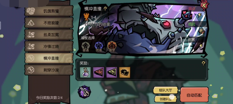 “横冲直撞”主要敌对生物是发条战车,小编建议加入四人小队,在【组队大厅】找队友或者选择【自动匹配】队友的方式,当然也可以自己战斗,只要自身实力够了,在面对发条战车时,不要上来就发起进攻,先对它的落雷,节省技能的使用能量,尽量在后期也有作战的力气,能雷落的不是很频繁时就可以打了,每次雷落下前能看见闪电的标准,提前预判。