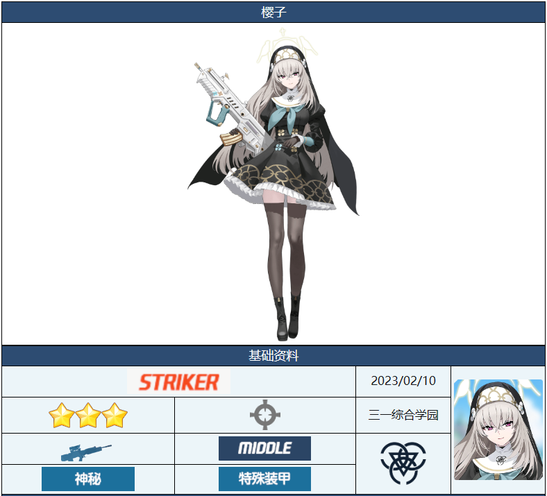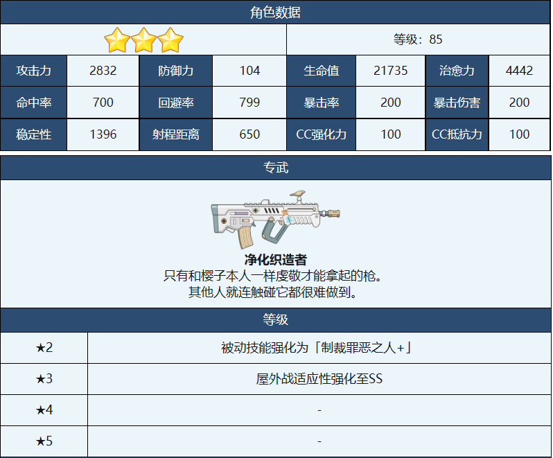 樱子是一位拥有治愈能力的学生,她的专武叫做净化织造者,是一种能够释放纯净之力的法杖。樱子的专武升级一览,专一:增加樱子的治愈总量和攻击能力。而专二则能增加樱子的治愈量和攻击力,并且使樱子的技能可以对敌方打出稳定伤害。专三则会增加樱子的治愈量和攻击能力之外还能使她的技能打出额外的输出量,并且还有机会使敌方进入混乱状态。