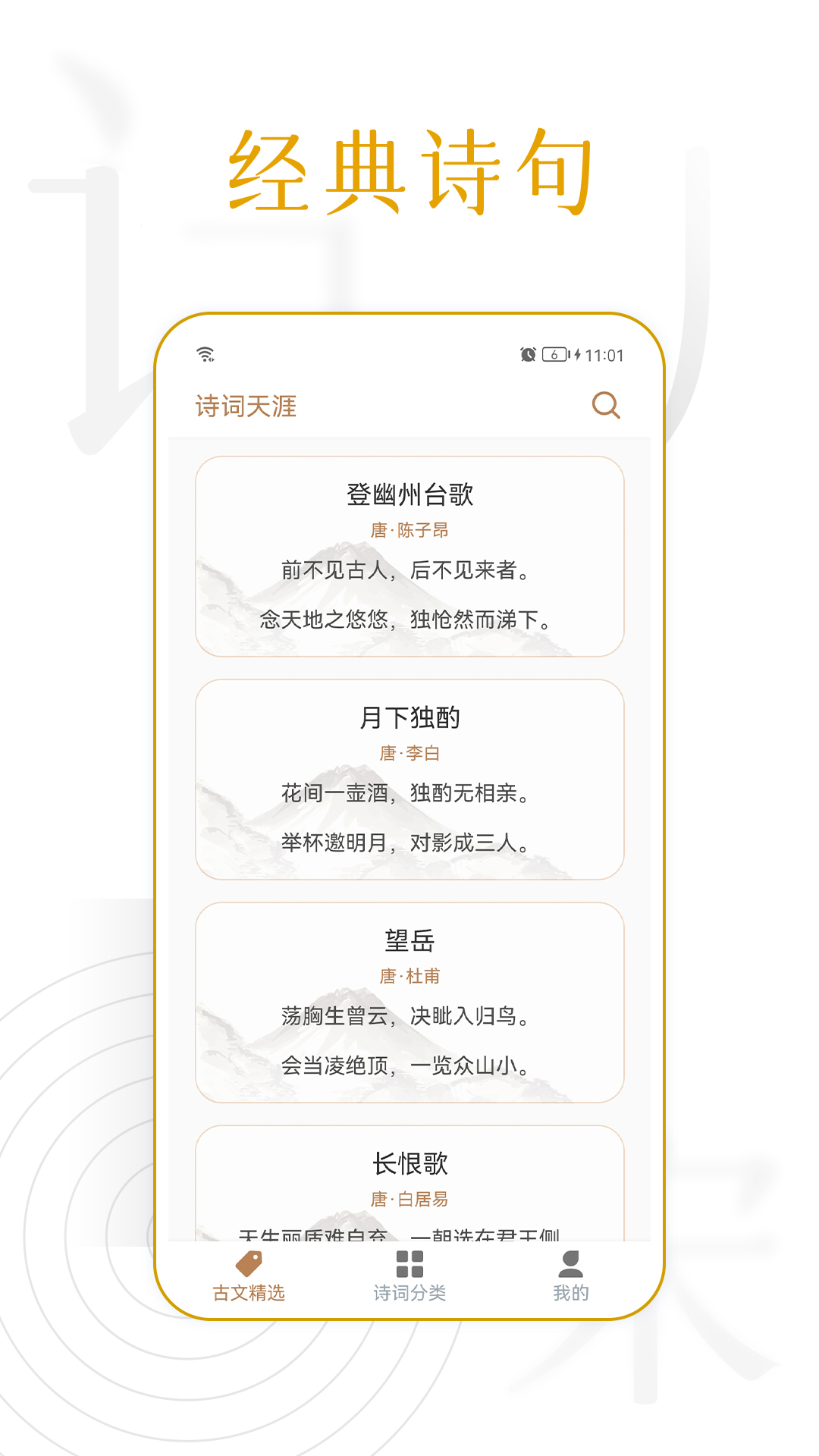 软件界面雅致、古色古香,呈现了经典诗词,一键搜索历史名家名作,欣赏优美字词。诗文用字极其讲究,简约又凝练,针砭时弊。