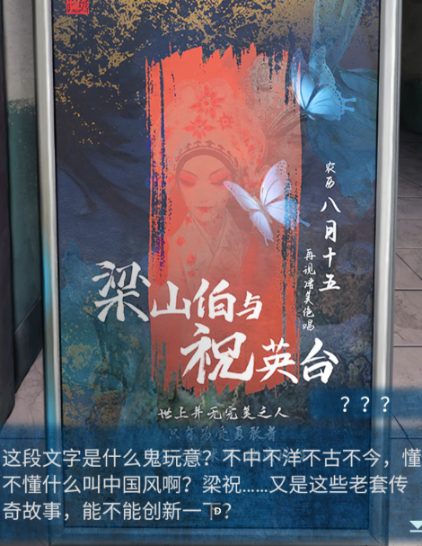 1,我们的主角陶梦嫣被荀元丰约来一家电影院里看梁山伯与祝英台的戏曲,钟梓萓一个人进了一号戏厅,这个时候玩家们可以先去拿电影票,这样就更换场景,前往售票处的是还需要注意一下,先点击物品栏中的现金在进行购买。