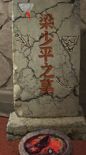 3,灭完后收集火堆里的伞和玉蝴蝶,注意:玉蝴蝶需要先点击草丛旁飞动的蝴蝶才会掉落下来。然后在返回点击场景墓碑收集线索,把物品栏里的玉蝴蝶安放在墓碑左上角。