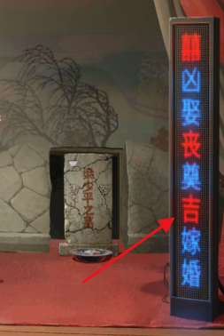 6.在回到座椅区,点击左侧箱子,按照戏台上的LED灯把字调成图片上的样子!获得毛笔。这关比较难,建议玩家们可以先把两次闪烁的字体给记忆下来才可以。