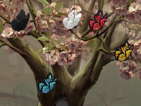 11,调整蝴蝶的高低,这一关是比较难的,首先要去戏台上收集线索,然后返回墓碑前,点击旁边的蝴蝶,按照1黑2蓝3白4红5黄,调整蝴蝶的顺序,在把2号蝴蝶下拉到最低端,在调整1,3,4,蝴蝶上拉最顶端就可以在树心里获得一个雨伞和拨浪鼓了,这一关是比较繁琐。