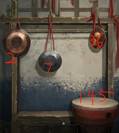 8,接着要把墙壁旁的布掀开,按照2736145的顺序敲击后,梳妆台的箱子才会对打开【这一关很多人不会过,是因为先要把梳妆台上的脸谱书给点击翻页,全部翻完才可以进行下一步,不然会提示线索不足】。