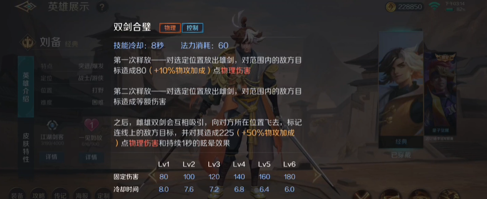 刘备的技能分为被动技能和主动技能两种。被动技能是剑斩乾坤,每两次普通攻击后,刘备会同时攻击,造成额外的物理伤害并标记目标,标记可以叠加,每层提高刘备对目标的伤害。主动技能有三个,分别是瞬息千里、风云剑诀和双剑合璧。瞬息千里是刘备的位移技能,可以让他快速冲向选定位置,并打出aoe物理输出和减速效果。双剑合璧是刘备的多段输出技能,可以让他在一定时间多段输出,并且双剑会键换位置并标记对手。风云剑诀是刘备的大招,可以让他召唤自身分身协助战斗,对技能指向区域打出物理伤害并群体标记,剑气会产出一个减速风墙,敌方目标途径风墙会减速50%。
