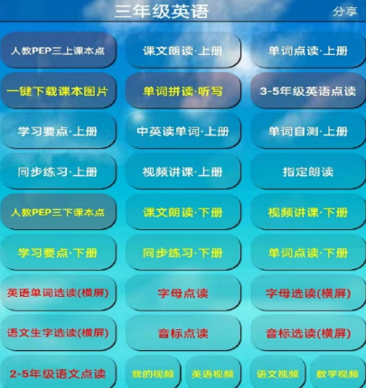 小学三年级英语上册具有专业的点读功能,其中包含课文点读、翻译单词、朗读等等,课文单词在线自测,另外还有字母、音标、点读、连读等等。各种内容和课本完全同步,学习要点难点全部包含。其中覆盖较为齐全的教材和版本,无论哪个版本都非常适用。