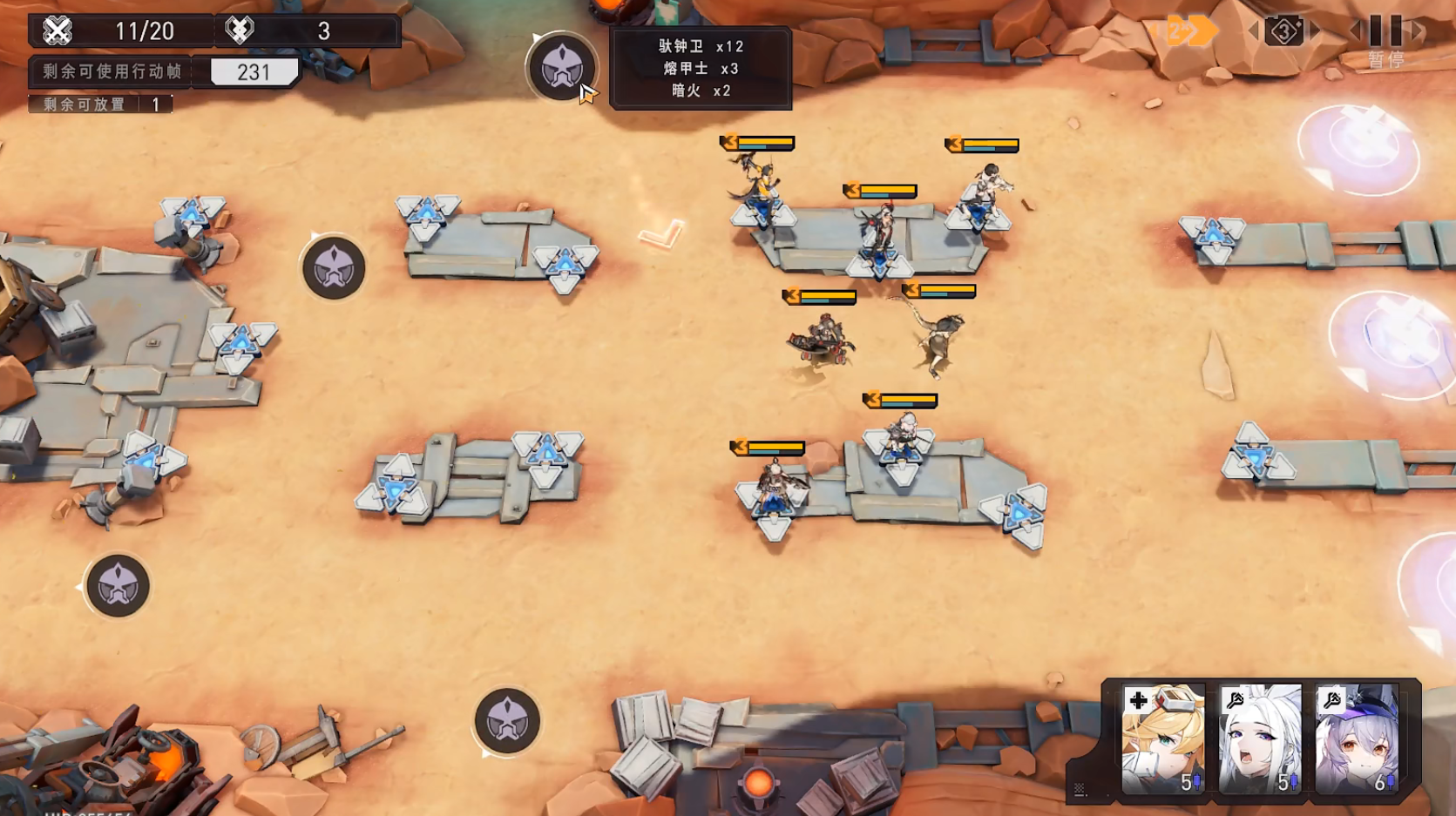 考虑到以上几个舍友的特点,那么在游戏中的通用站位应该是这样:开局先在敌人的必经之路放下进击舍友,在挡住敌人进攻的同时快速回费;在积攒够一定费用之后,再找到关卡的交通要道放下守护类舍友,抵挡住敌人的进攻;围绕着守护舍友,在高台上布置狙击舍友来消灭敌人,放下行医舍友为守护舍友回血,最后等到费用足够的时候,再在行医舍友的治疗范围内放下暗术舍友和辅助舍友,这样一个攻防兼备的防御体系就构建完成了。