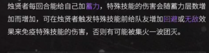烛贤者有一个攻击特点,在每一个回合里面他都会给自己蓄力一层能量,能量积攒的越多后面放输出大招的时候伤害就越高,所以大家要是可以前期就解决掉烛贤者的话,就尽量的早点解决,毕竟到了后期它会越来越强,如果单人角色的输出不够的话,建议大家是可以集火。
