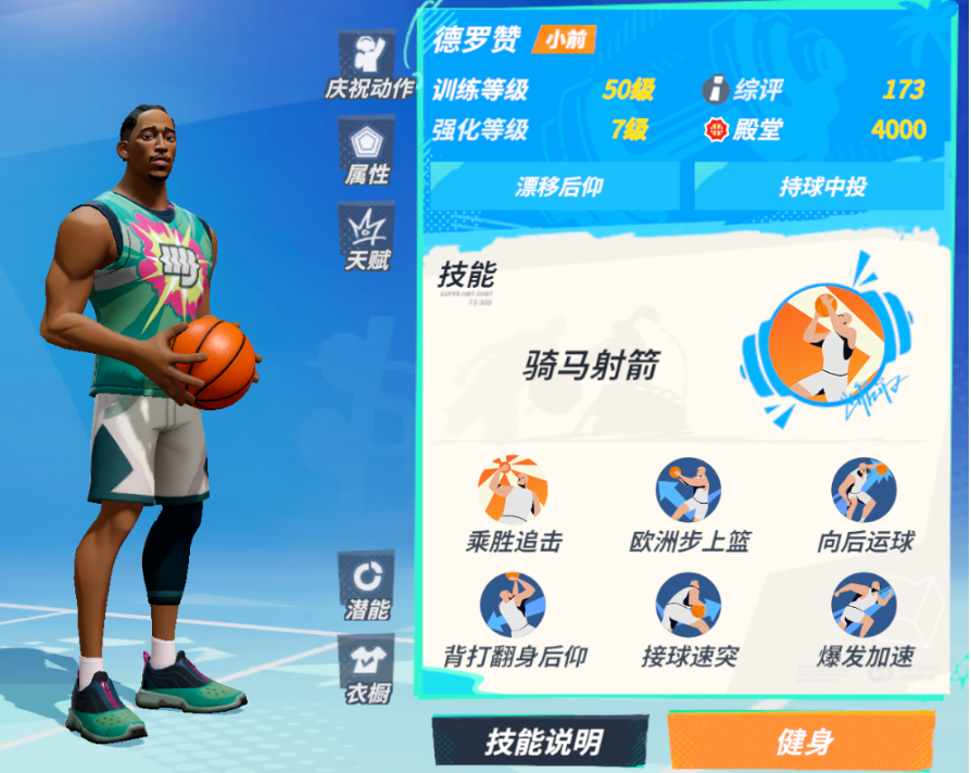 核心技能这块,其主动技能是骑马射箭,他可以向侧边一步运球并以一个高抛的角度将球打出,这招在无人防守的情况下是必定命中的,而且对比同类型的其他必中类技能,它在出手前会有一个小小的位移,相对来说更容易摆脱防守。核心被动则是在进球后会提供额外的中投抗干扰加成,这个加成可以令德罗赞的中投更加稳定。