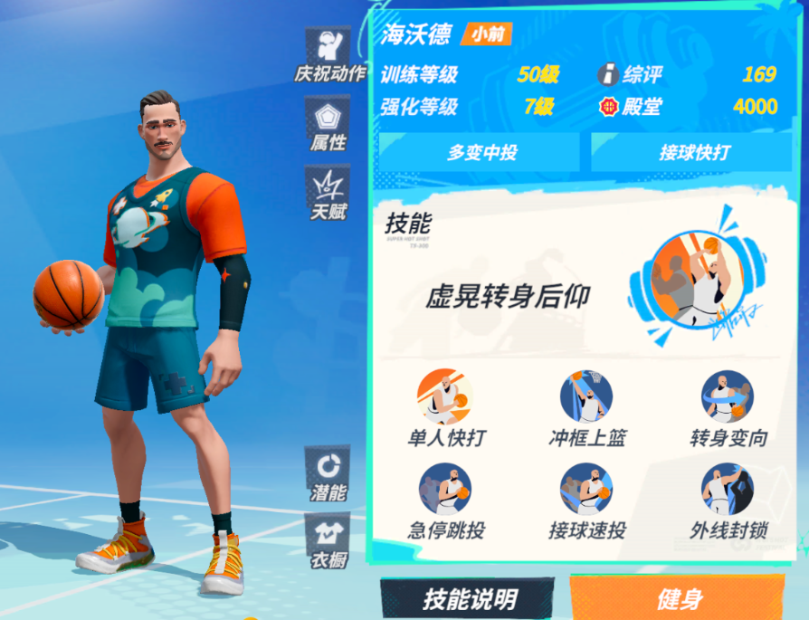 核心技能这块,主动是提供一个虚晃后转身后仰投篮的特殊动作,该技能无干扰情况下可必定命中投篮,此外,通过升级还能大幅提升抗干扰,从而实现强硬的顶投。被动则是“单人快打”,可以在接球后的两秒获取额外移速加成,后续可衔接各种动作突入内线或是后撤拉出投篮空间。