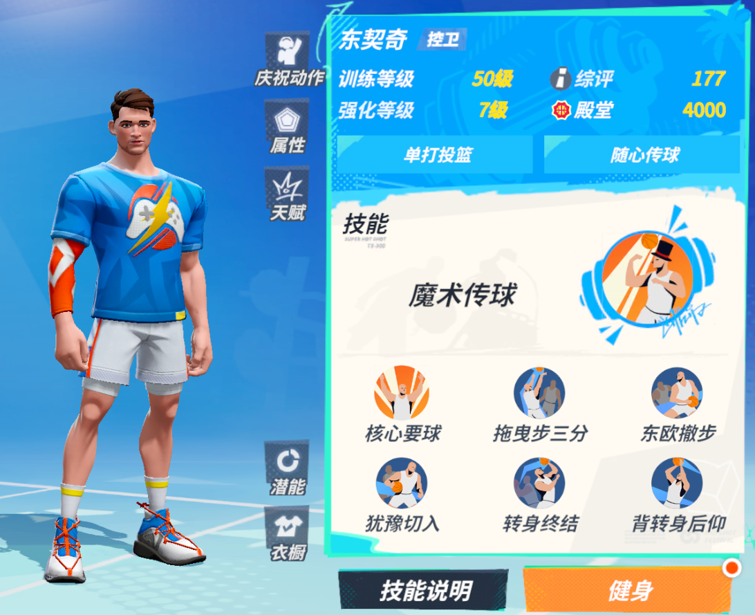 技能方面,东契奇与其他人一样拥有两个橙色技能和五个小技能,其中主动的橙色技能是“魔术传球”,可以让他在持球和进攻的任何情况下将球传给队友,并且该技能所需的士气非常少,只要五百就能使用,每次使用基本都可以帮助你化解一次包夹危机,同时经过升级强化该技能还可以让接球队友获得更高的命中率。