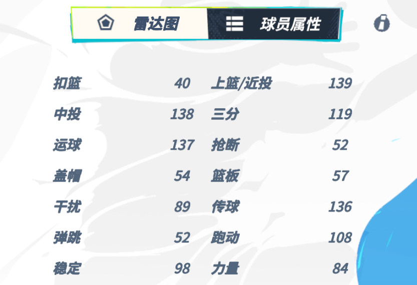 再看具体属性的话,可以发现东契奇的上篮/近投这一项是最高的,这意味着当他突入到篮筐附近时会有着很高的命中率,另外138的中投和137的运球也使其完全拥有运球后投篮的能力,虽然在离篮筐远了之后这种能力会也有所下滑,但投进三分还是没什么问题的,毕竟119的三分属性也摆在那里。