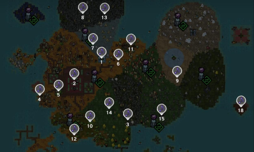 然后来到平原的传送点,在左侧的树林后面的空地那里有第七个音符,右上角的居住区那里种上苗子能获得第八个音符,接着坐船去外边的小岛,那里有第九个音符。继续传送到桦树林的传送点,左上角的空地有第十个音符,右侧的三棵树那里的草根有第十一个音符,在最下面的河岸对面击败秋季Boss获得第十二个音符。