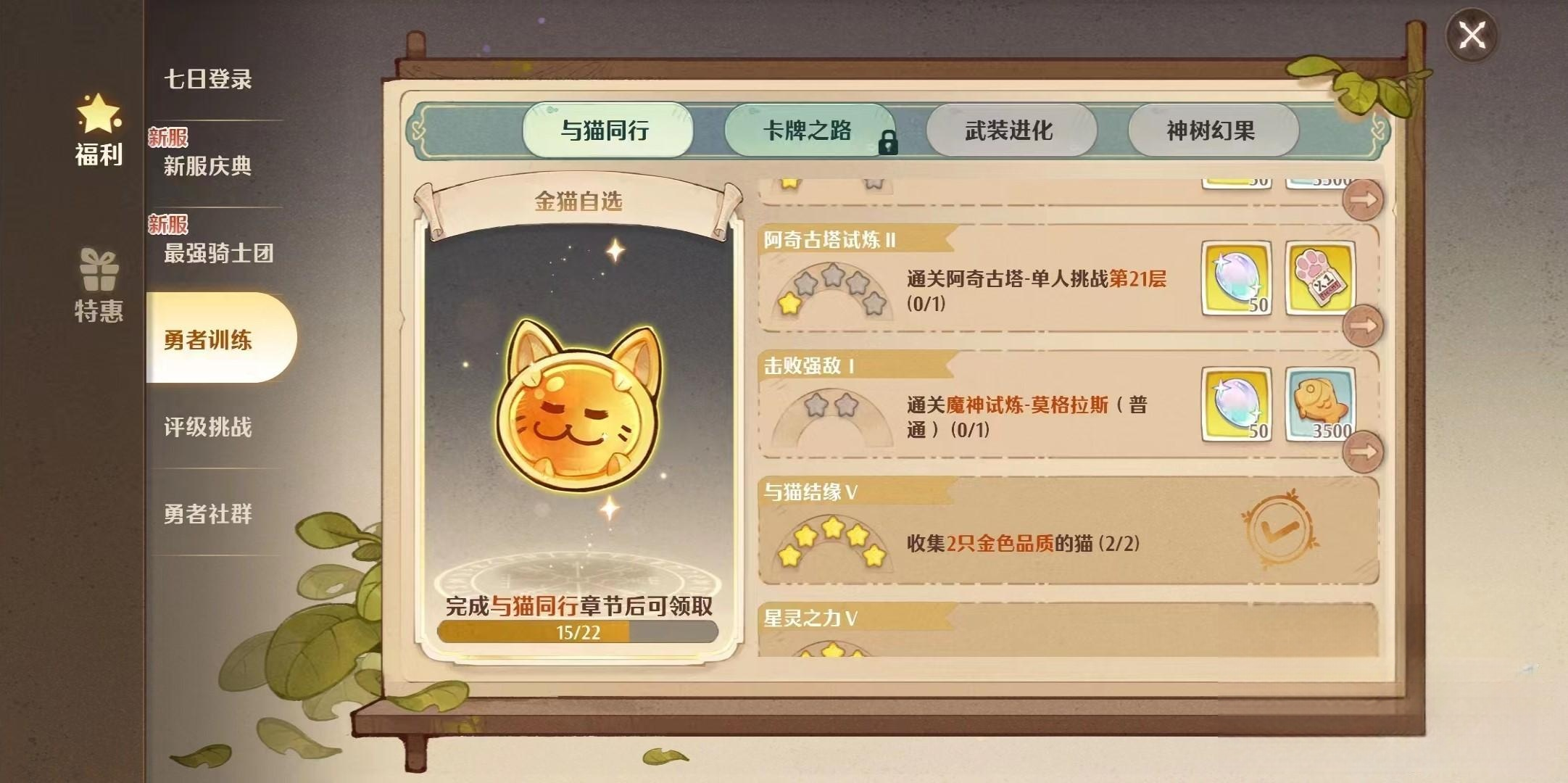 第二个板块是“卡牌之路”,需要先完成猫灵那一部分才能解锁,里面需要你做的事其实和与猫同行大同小异,就是需要你收集并培养卡牌,毕竟这些卡牌都能提供属性增益来强化角色,通过完成它也可以获取一些卡牌方面的培养资源。