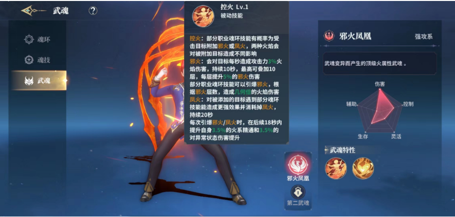 被动技能上面是一个控火的技能,触发的时候会根据前面给的标记来提升输出,如果前面施加了邪火的标记,就会有持续10秒的3%攻击提升效果,后续还可以叠加,如果是引爆邪火或者是凤火的话,带来效果则是在异常伤害上面,最后一个被动是为邪火凤凰带来6%的暴击概率提升。