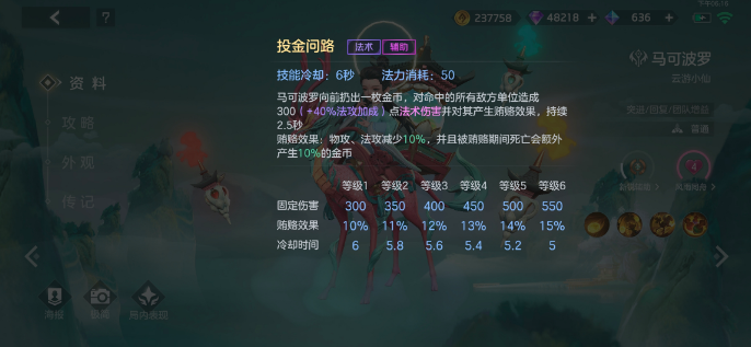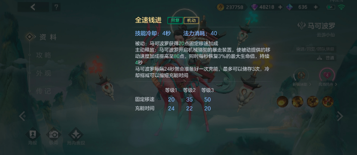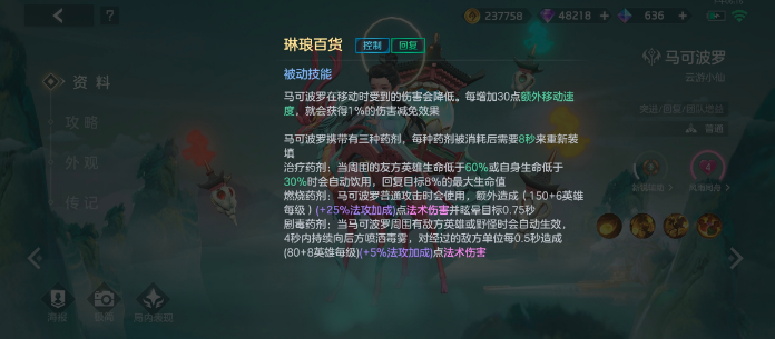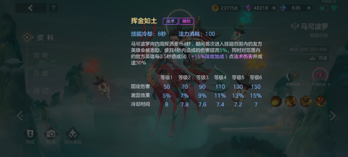 团战使用一技能效果是不错的,二技能是持续4秒的增益效果,也是建议大家在团战中使用的,给队友加上的输出效果搭配上面的影响敌人输出效果,团战的胜利率会拔高很多,最后大招看起来虽然不怎么样,但是突然增强的移速是可以让马可减少受到伤害的,而且还可以储存起来带来恢复效果,这一点可以让马可波罗就算被围攻也保下命。