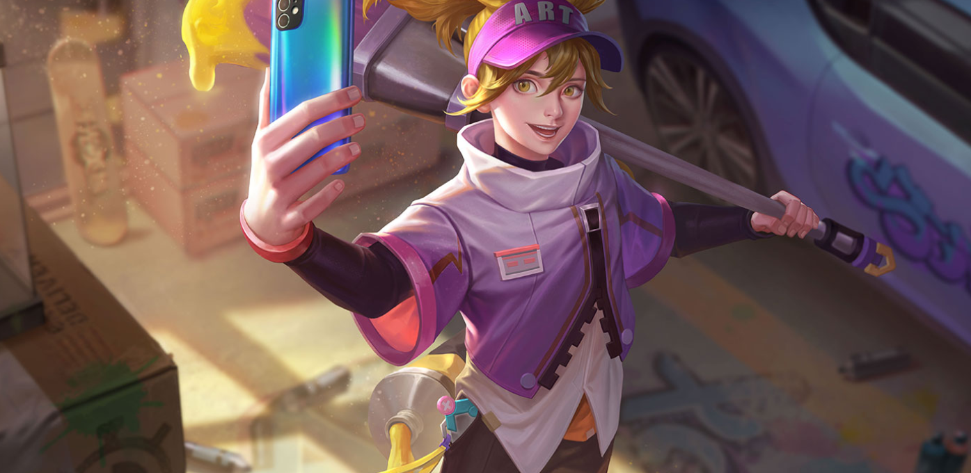 然后就是二一年出的这个老皮肤“街头艺术家”,他相较原皮做出了较大的改变,整体衣着打扮变成了现代风格,并且换上了潮流感十足的粉衣服和金发,其特效呈现也同样做出了对应的改动。