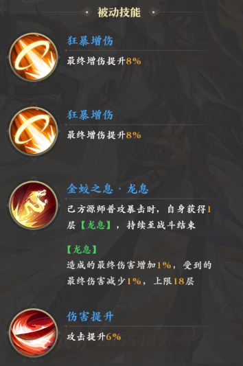 被动这块,他有着两个8%的增伤和三个提升攻击力的效果,此外,其专属的被动“金蛟之息·龙息”也十分有特色,可以令其在普攻暴击时也同样获得一层龙息。