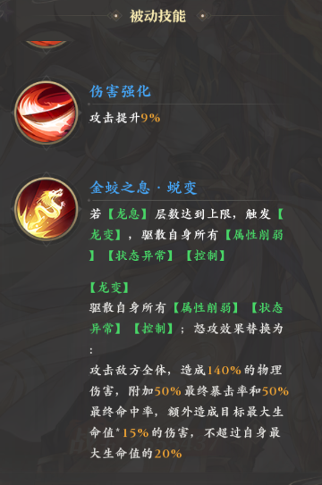 后续获取的“金蛟之息·蜕变”还能让武煌在龙息层数达到上限时触发龙变,以此驱散身上的所有debuff,并且之后怒攻技能还会得到大加强,伤害变为140%的物理伤害,而攻击范围则扩散至全体敌人,同时它还会附加角的暴击率和命中率加成,并且命中时还可以对敌人造成15%最大生命值的额外伤害。