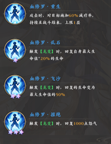 通过觉醒还可以获取四个血修罗系列的被动,其中包括能给敌人挂60%减疗的“重生”,以及触发龙变时能回血的“乱石”和“飞沙”,还有能回怒气的“摧绝”。