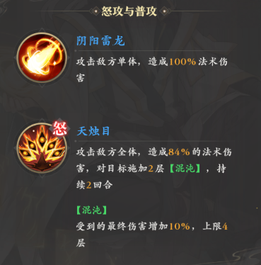 技能方面,其怒气技能可以对敌人全体造成84%的法术伤害,虽然加成倍率偏低,但考虑到范围大,而且还能给敌人施加混沌效果来提升后续所受伤害,所以它的实际作用还是可以的。