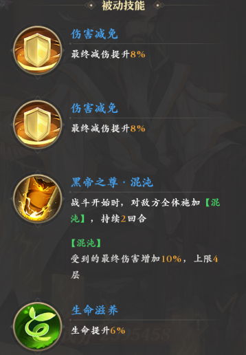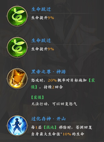 被动这块他固定的五项属性增益和一些辅助角色类似,加的都是减伤和生命,不过这也正好进一步发挥了他高血量的优势,然后他独有的两项被动是“黑帝之尊·混沌”和“黑帝之尊·神游”,前者可以让敌人两回合内所受伤害增加,后者可以让苍渊在怒攻时有20%几率为敌人施加三回合的无法行动效果。