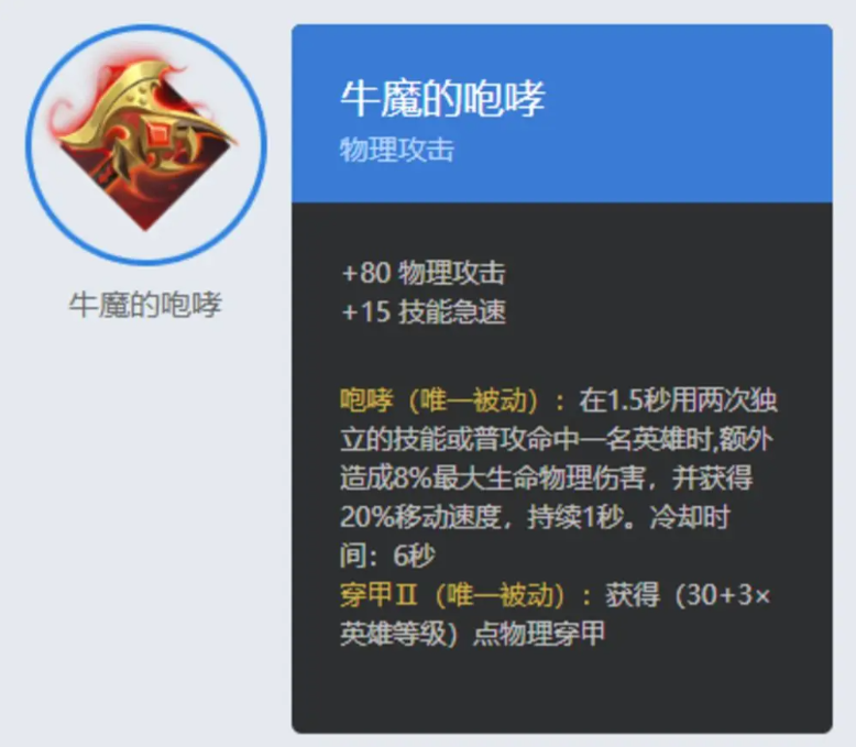 出装方案二:牛魔的咆哮、狩猎之翼、耀光臂甲、平衡支配者、不朽之王、上横使者。这套出装是比较偏重防御和生存的,适合面对物理伤害较高的敌人。狩猎之翼可以提供移动速度和物理防御,并且在受到伤害时增加自己的攻击速度,耀光臂甲可以提供生命值和魔法防御,并且在受到魔法伤害时反弹一定比例的伤害,平衡支、不朽之王作用同上。