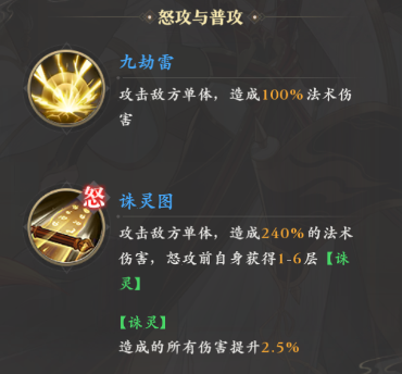 圣元的普攻与其他法术系角色没什么区别,都是100%单体伤害,特殊的地方还得看怒气技能,这一技能可以让其对单体目标造成240%的法术伤害,同时还会在造成伤害之前获得1~6层诛灵,每层诛令都能够令其伤害提升2.5%。