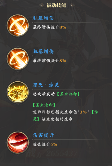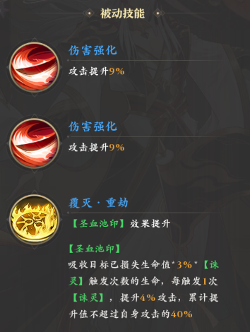 被动方面仍然包含了照例的五种属性提升,圣元这里提升的是伤害和攻击力,对于进攻端会有很大帮助,自己的独有被动则是“覆灭”和“窥伺”系列的技能,其中覆灭包括了能够吸血保障续航的“诛灵”,以及能提升吸血效果和攻击力的“重劫”。