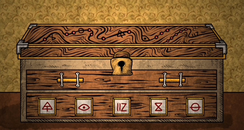 在进入这一关的时候,画面上面出现的有一个木盒子,这个木盒子如何打开就是这一关的难点,大家可以先观察一下盒子盖上面的花纹,在花纹上面是有很多红色小珠子的,而每一个区域的小珠子数量都是不一样的,上面的区域对应的是盒子下面显示的按钮。