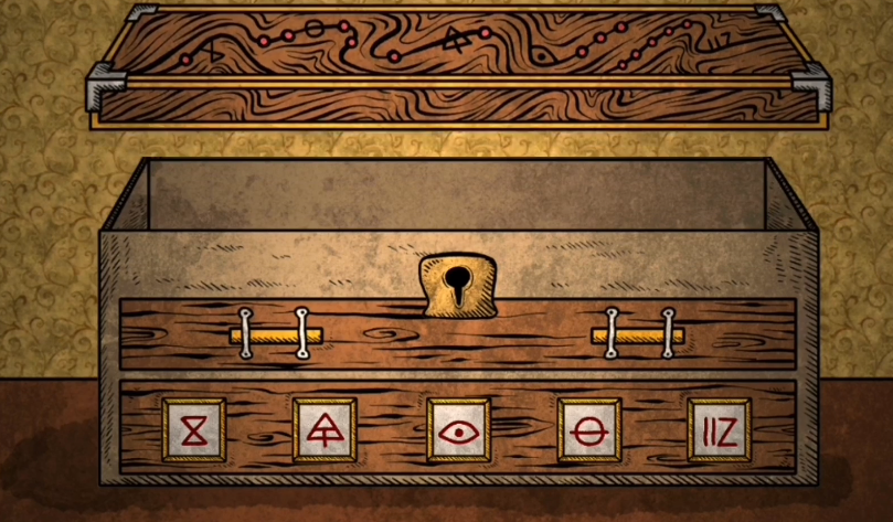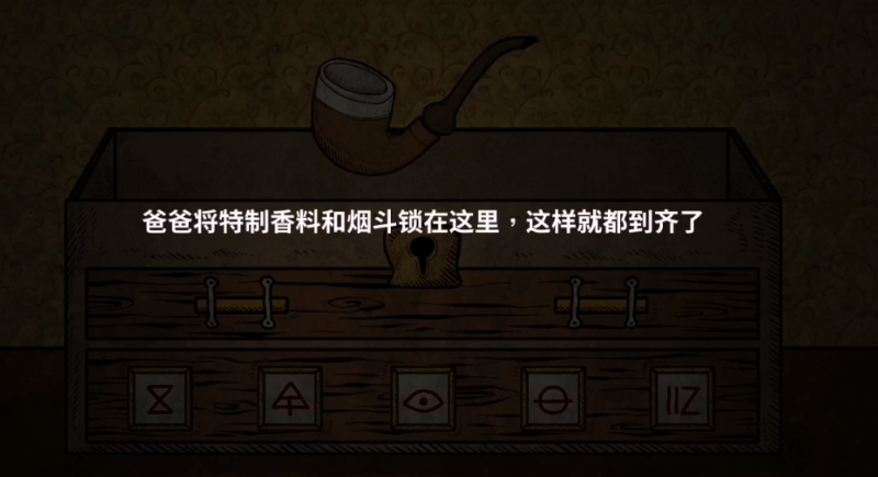 有五颗红珠子的地方下面的按钮就水命是要第五个点击的,以此类推大家就可以知道按钮按下来的顺序啦,输入正确的密码位置之后大家就可以在上面打开木盒子,盒子里面放着的是父亲的烟斗以及香料,这就是下一关需要的道具啦。