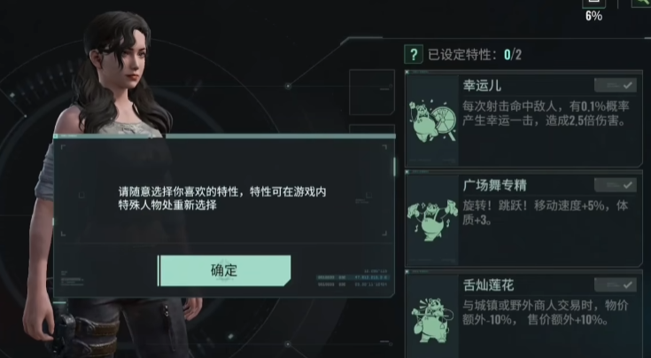 移动速度的提升可以让您在战斗中更具机动性,而额外的体质将增加您的生命值,提高生存能力。幸运儿,射击命中敌人有0.1概率造成2.5倍伤害,幸运儿的特性为您提供了一些爆发能力,但触发概率较低。这个特性可以在关键时刻带来意外的伤害,适合那些喜欢高风险高回报战术的玩家。舌灿莲花,与商人交易买东西物价-10%,卖东西物价 10%,这个特性适合那些注重经济和交易的玩家。