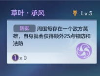 草叶·承风:防御周围每存在一个敌方英雄,自身就会获得额外25点物防和法防