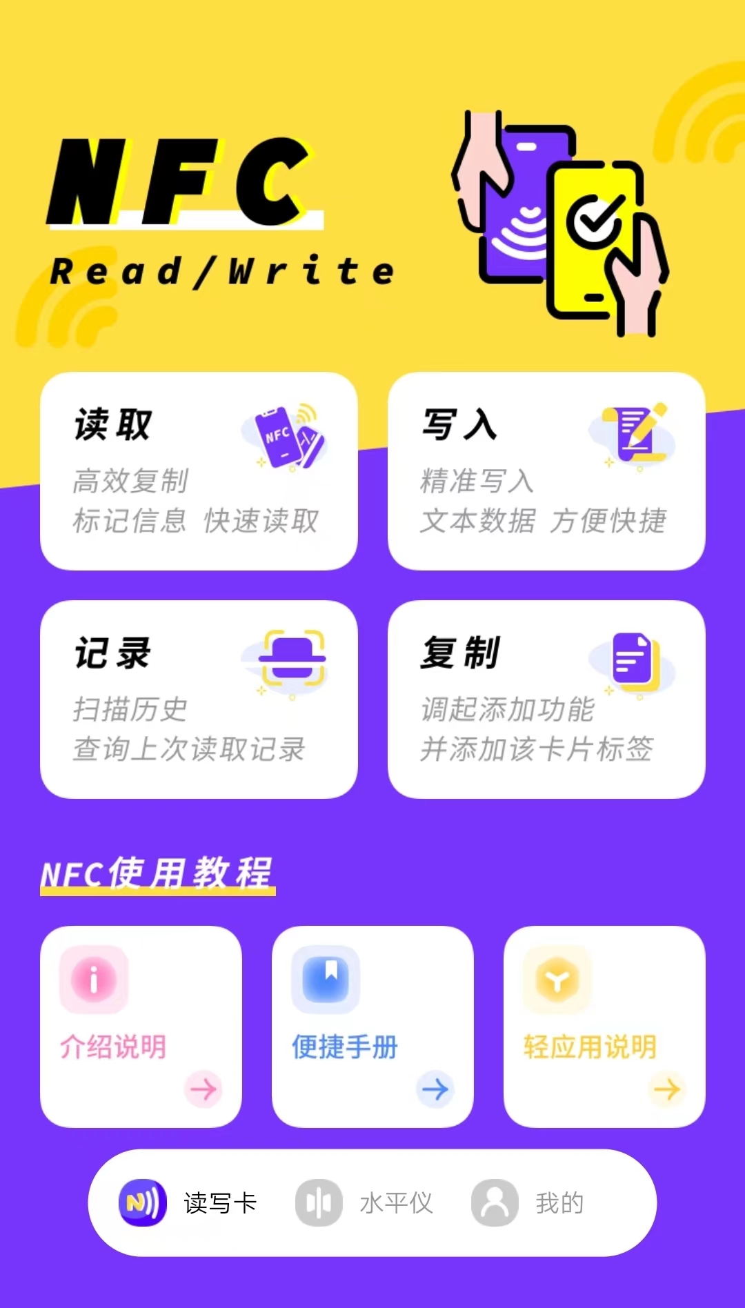 公交卡这款软件是一款比较高效便捷的电子卡片app,不仅支持读取门禁卡,还支持公交卡等多种卡片类型,是一款被大家一致好评的软件app,只要我们的手机支持NFC功能,就可以轻轻松松的应用这款软件,可以轻轻松松的刷卡开门,避免忘记带卡的尴尬,对于住小区的人来说非常实用,非常方便。可以读取高效复制,快速的读取,文本数据非常清晰,方便快捷的书写,还可以记录上次读取的记录。