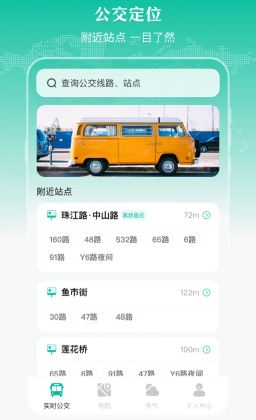 实时公交这款软件是一款方便快捷的一款软件,可以进行公交定位,对于我们附近的公交站点一目了然,还可以给我们提供坐公交的路线,公交车距离我们多远,这款软件还有导航,可以把我们想要去的地方都可以输入出来,就可以出来路线。最实用的一个功能就是提供天气情况,可以有效的避免天气影响我们的出行。