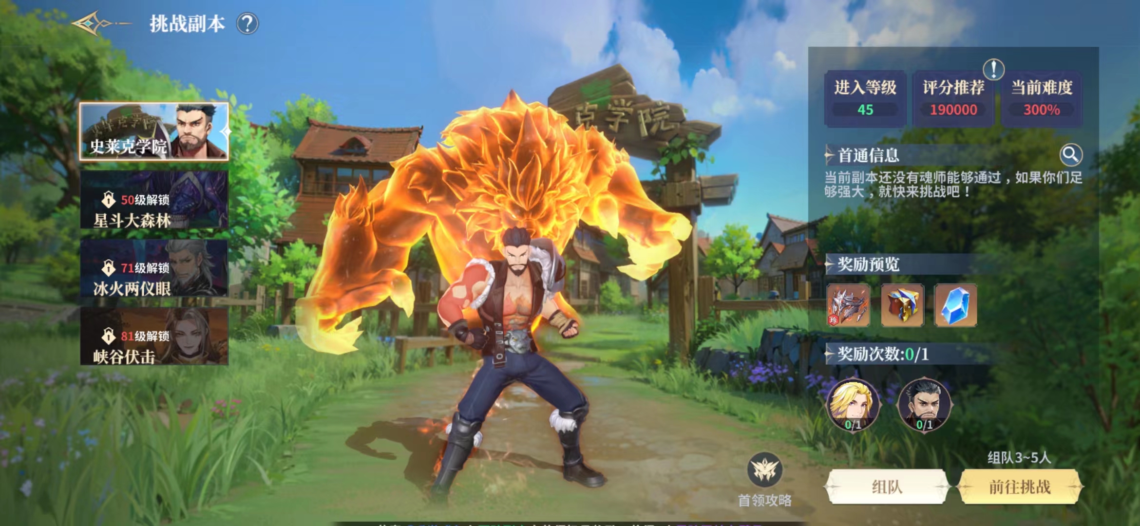 这里有大家熟悉的史莱克学院、星斗大森林、冰火两仪眼以及峡谷伏击地图,45级解锁之后大家只能先去挑战施雷克学院,通关这个地图之后才可以解锁森林的挑战,而且需要大家达到50级才可以进入其中,在大家想进入的时候其实可以查看一下旁边的评分,如果评分是大家达到的战力,那么就可以去挑战看看啦。