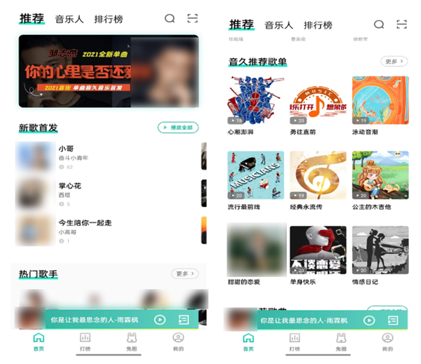 软件本身的歌曲库也是十分齐全的,首页界面非常清新干净,分为了推荐、音乐人以及排行榜三大板块。登录账号长时间使用就会在首页根据我们平时的听歌习惯和喜好来推荐一些类似的歌曲,音乐人栏目更是会自动将我们爱听的歌手置顶优先显示,体验感还是相当不错的。