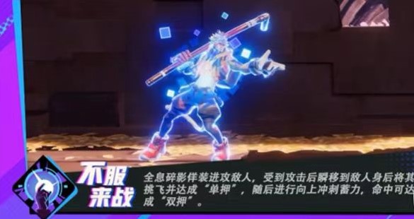 在游戏里面全息碎影一共有那么几个技能,首先是他的一技能,名为不服来战,如果在战斗的时候,玩家受到了敌人的攻击,那就会以最快的速度移到敌方的背后,还可以使用技能将他给击飞掉,这样就可以形成单押,之后紧接着就可以直接向上进行冲刺,并且要蓄好力,这样打中了敌人就可以形成双押。