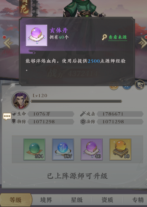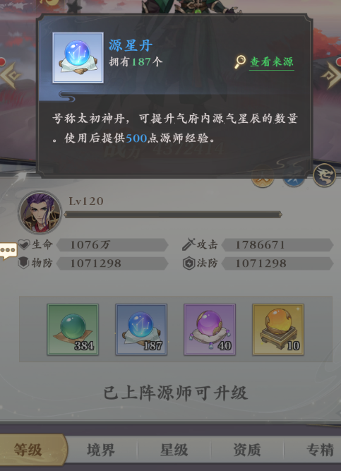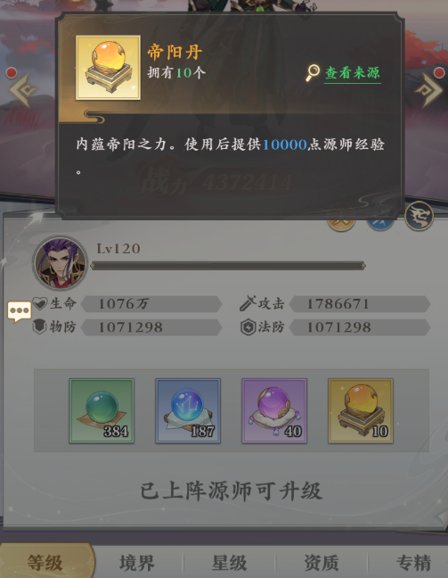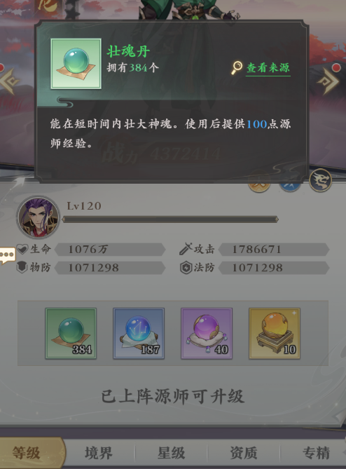 升级的方法是点击“源师”,然后选择想要提升的目标,之后点进“培养”板块即可进行等级的提升,不过升级需要消耗丹药,目前共有四种丹药可以帮助你提升源师,第一种是绿色的“壮魂丹”,可以提供一百点源师经验,它也是最容易获得的一种丹药,但用于升级的话效率较低。